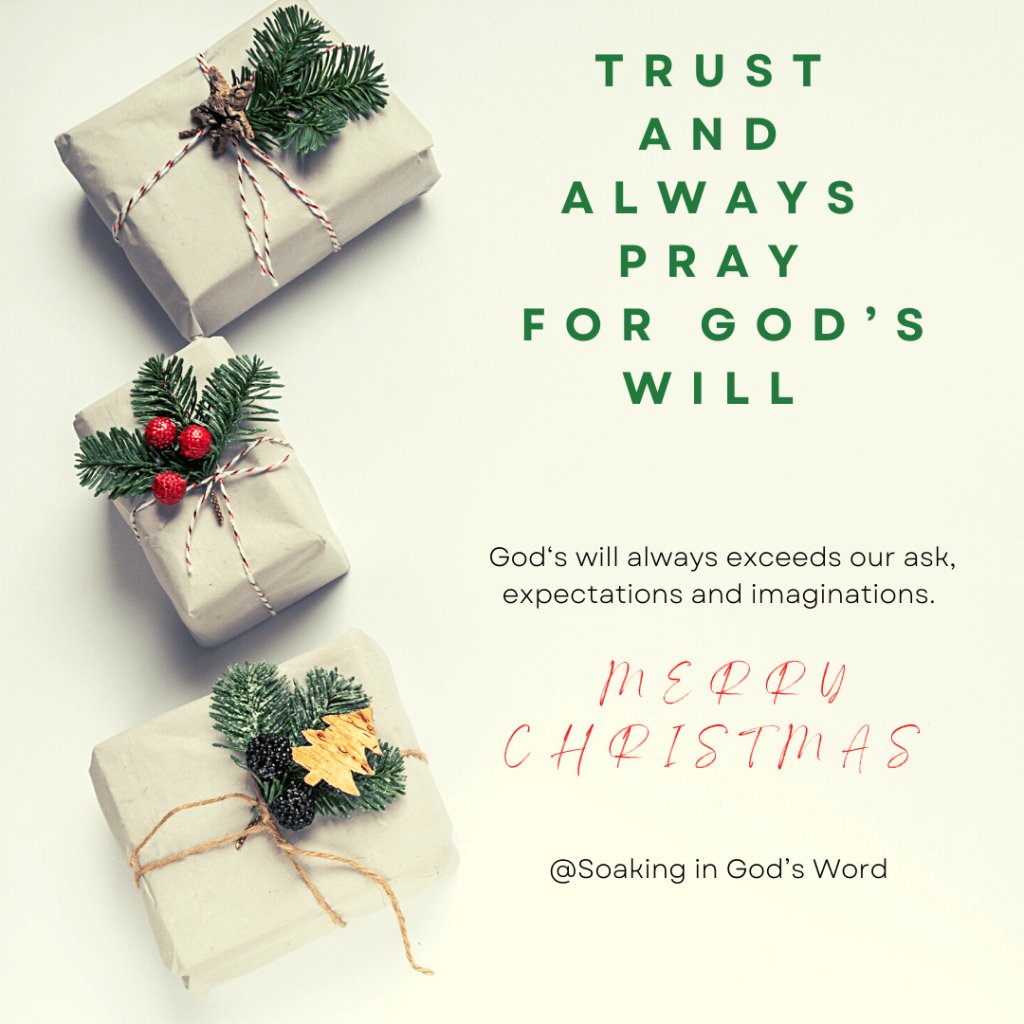 Beloved in Christ, I am urging us to pray God’s will to be done on earth as it is in heaven just like our Lord Jesus taught us in the Lord’s Prayer (Thy will be done on earth as it is in Heaven). After we have prayed God’s will, let obey God’s will/ His word, trust and wait on Him. It may seem that it is taking too long, or even God is silent but we ought to always trust that even when we can’t see, God is working. Have faith in God and always know that God’s perfect will always work out perfectly for our good and to the glory of His name. Be blessed and Merry Christmas!